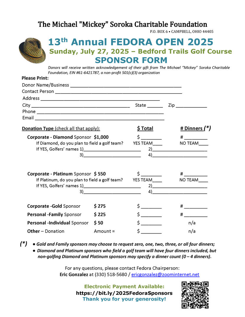 Golfers and non-golfers are welcome to join us for the 13th Annual Fedora Open Golf Outing on Sunday, July 27, 2025 (the last Sunday in July). This is our only fundraiser in 2025. As usual, the event will include dinner, a chance auction of dozens of baskets, and a 50/50 raffle. Sponsor and golfer forms are below.If you do plan to attend as a non-golfer and would like to order a dinner, which usually starts around 1:00, please let us know in advance by contacting the Chairperson, Eric Gonzalez at (330) 518-5680 or ericgonzalez@zoominternet.net. We hope to see you there!