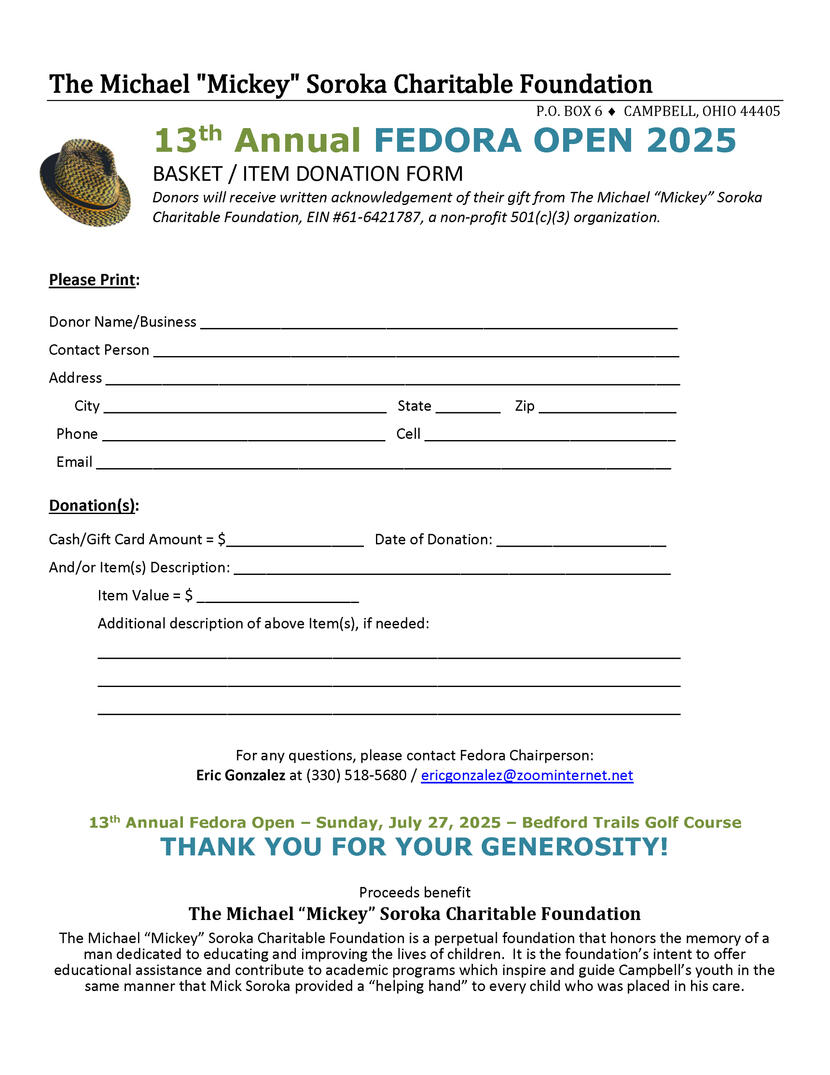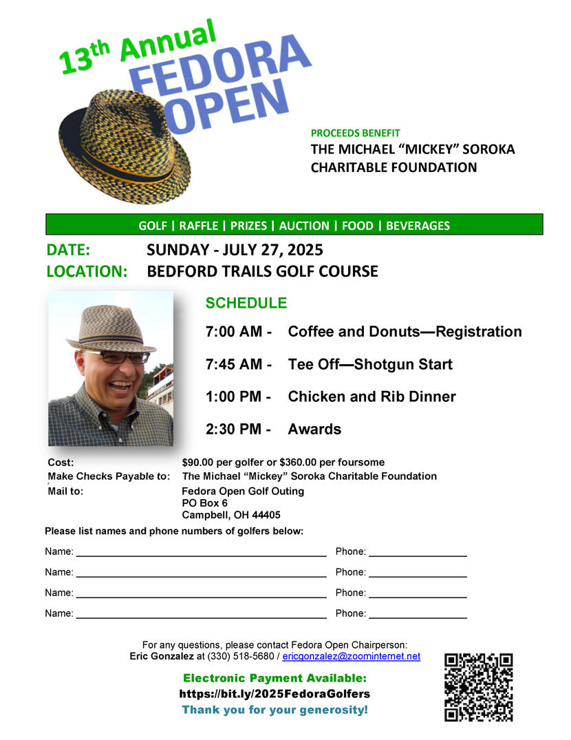 Golfers and non-golfers are welcome to join us for the 13th Annual Fedora Open Golf Outing on Sunday, July 27, 2025 (the last Sunday in July). This is our only fundraiser in 2025. As usual, the event will include dinner, a chance auction of dozens of baskets, and a 50/50 raffle. Sponsor and golfer forms are below.If you do plan to attend as a non-golfer and would like to order a dinner, which usually starts around 1:00, please let us know in advance by contacting the Chairperson, Eric Gonzalez at (330) 518-5680 or ericgonzalez@zoominternet.net. We hope to see you there!